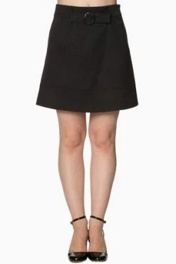 Just look at this stylish, rockabilly, ladies mini skirt from Banned, a classic black skirt which flares out to just above the knee and has a belt detail at the front.