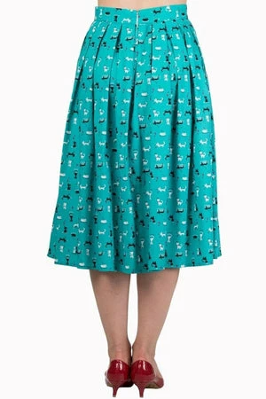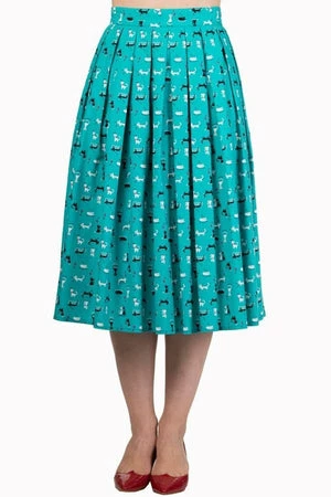 A phenomenal vintage, ladies skirt from Banned Apparel the “bright lights skirt”, in an eye-catching turquoise colour, with a cute black and white cats print..