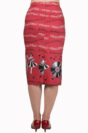 The vintage pencil skirt has music themed print, back zip closure and it fastens with a zipper at the back.