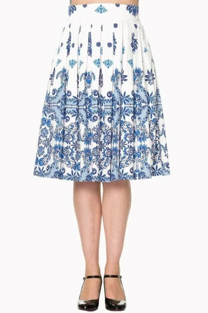 This is a striking, retro style ladies skirt by Banned Apparel, the “follow you skirt”, with an appealing geometric floral design. This style is available in blue with white print or white with blue print
