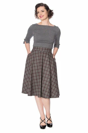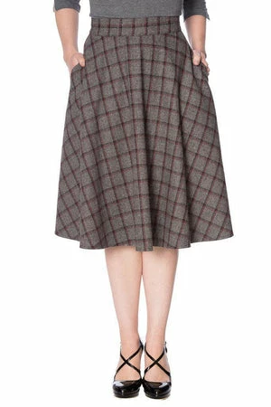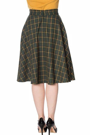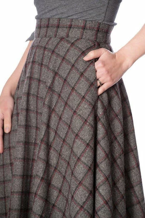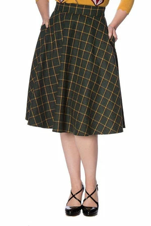 The swing skirt has a multi checkered print, side seam pockets, a figure accentuating shape and it fastens at the back with a zipper.