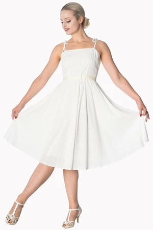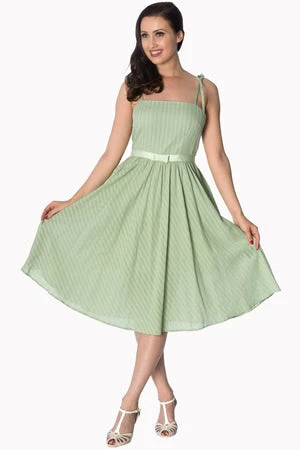 You’ll love this exceptional, rockabilly, ladies dress from Banned Apparel, available in pink, off-white and green. The style has spaghetti straps at the neckline, a matching waist ribbon tie and a flared skirt.