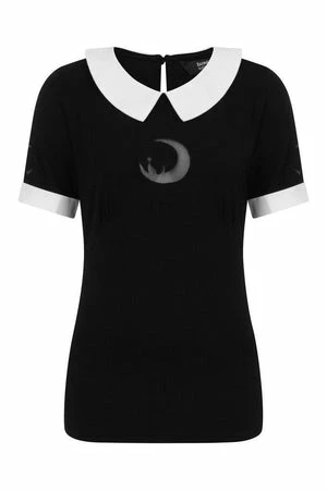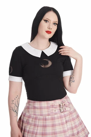The dark top has contrast collar and neckline, moon embroidery design, a round neckline, short sleeves, back button closure and a figure accentuating fit.