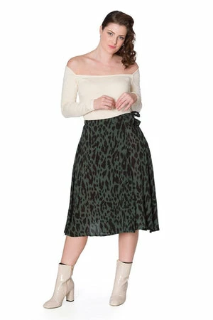 The flared A-line skirt has camouflage design, waist tie detail and a flattering fit.
