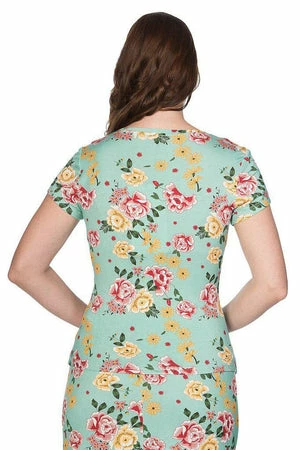 The t-shirt has a floral design, a V-neckline, short sleeves, elasticated front and a figure accentuating fit.
