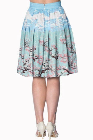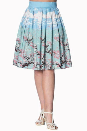 The vintage skirt has an oriental blossom themed print, a figure accentuating shape and it fastens at the back with a zipper.