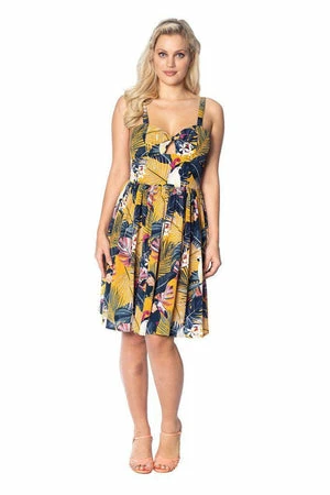 The vintage paradise dress has a sweetheart neckline, a figure accentuating shape, bow and keyhole cut-out detail and it fastens with a back zipper.