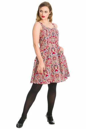 The gothic dress has allover pirate themed print, a sweetheart neckline, side pockets and hidden back zipper.
