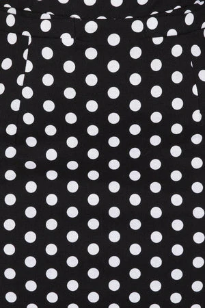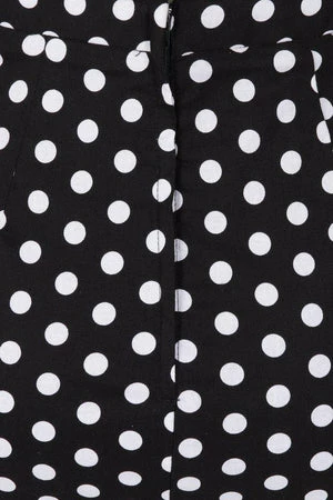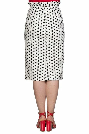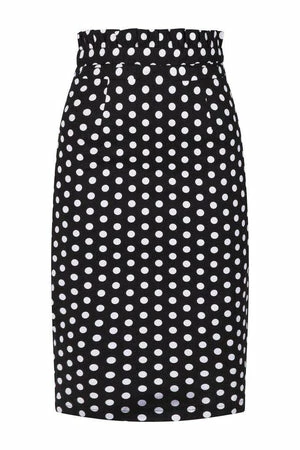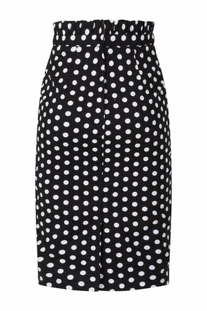 The vintage pencil skirt has polka dots design, waist frill detailing, a figure accentuating fit and it fastens with a hidden zipper at the back.