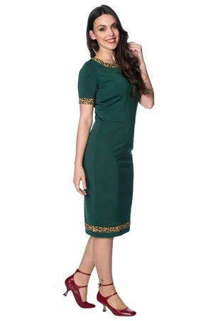 This vintage pencil dress has a leopard printed neckline, cuffs and hemline, a crew neckline, short sleeves, darted bodice, seamed waist and it fastens with a zipper at the side.