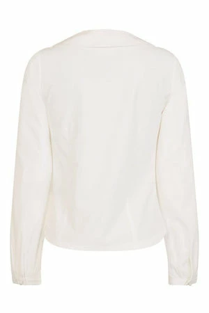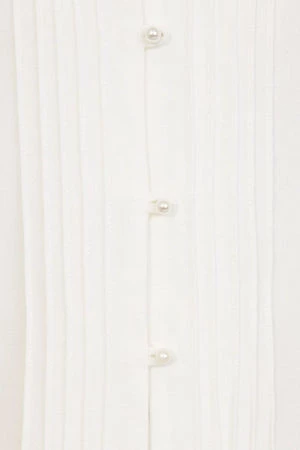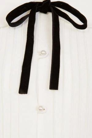 The vintage shirt has a front bow detail, pleats detail, a high neckline with big collars, full length sleeves and it fastens at the front with buttons.