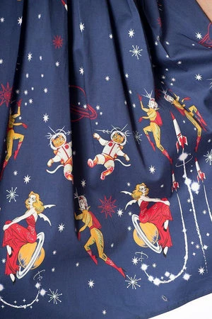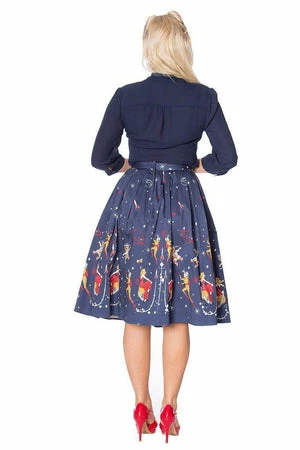 The 50s cotton satin skirt has vintage sci-fi inspired in house border print, pleats detailing, a figure accentuating shape and it fastens at the front with buttons.