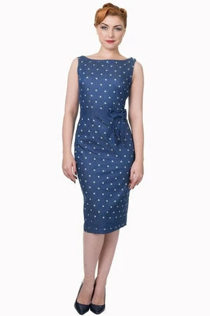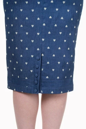 A phenomenal, rockabilly, sleeveless denim dress style from Banned Appare, the “sweet treat pencil dress”, with a fabric belt at the front, back leg split with button details, a contrasting, white hearts print and a hidden zip at the side to fasten.