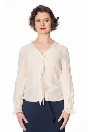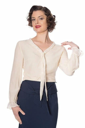 The secretary style blouse has front tied detail, full length frill sleeves and it fastens with buttons at the front.