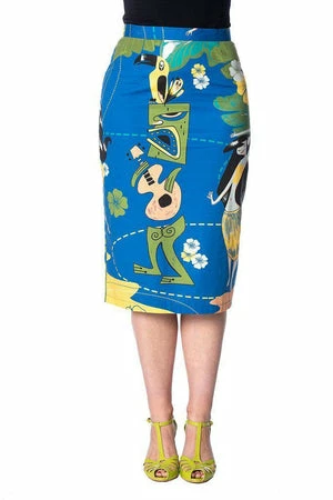 The vintage skirt has tiki themed print, a figure accentuating shape, a back slit and it fastens with a zipper at the back.