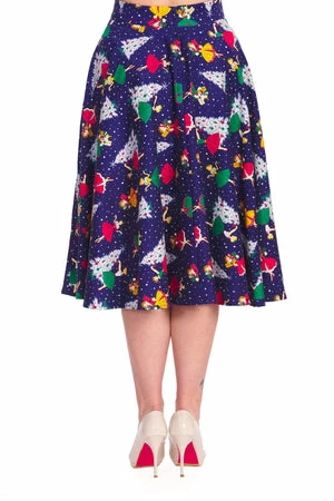 The vintage A-line skirt has a Christmas themed print, side pockets and it fastens with a hidden zipper at the back.