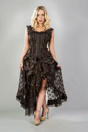 This Athena overbust brown stripe brocade corset has a zip front opening with laces and modesty panel at the back.
