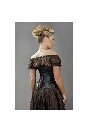 This Biker underbust, matte vinyl corset has brass studs, brown matte vinyl piping, straps, front buckles detailing, zip fastening and back lace fastening with modesty panel.