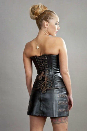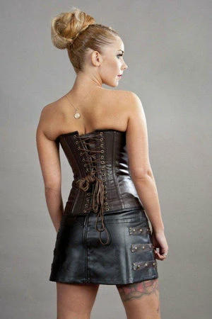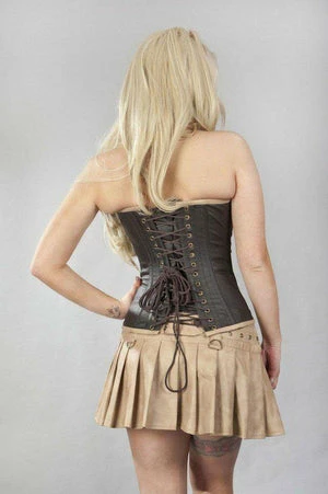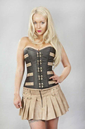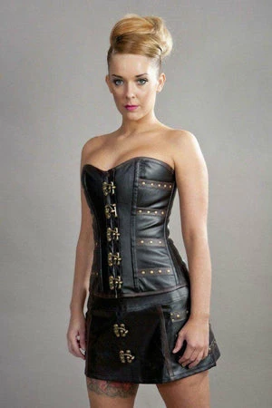 This C-Lock steampunk overbust, matte vinyl corset has brass studs, matte panels, brass c-lock fastening and back lace fastening with modesty panel.