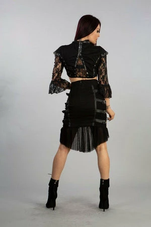 This Cecillia knee length punk rock black twill skirt has black fishnet panels, fake leather silver details buckles and a flattering fit.