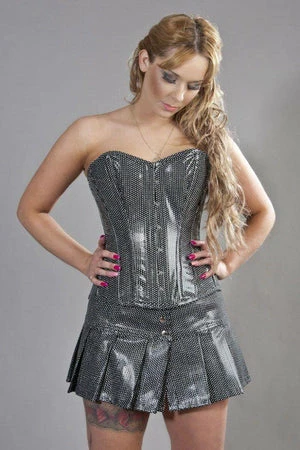 This Elegant overbust steel boned waist training black vinyl corset has studded diamante inlay, clip fastening, laces and modesty panel at the back.