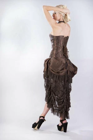 This Elvira long brown taffeta maxi skirt has brown lace underlay, mesh frills, side zip fastening and a flattering fit.