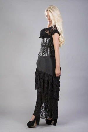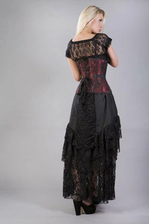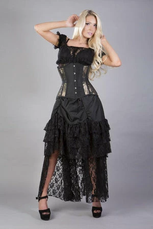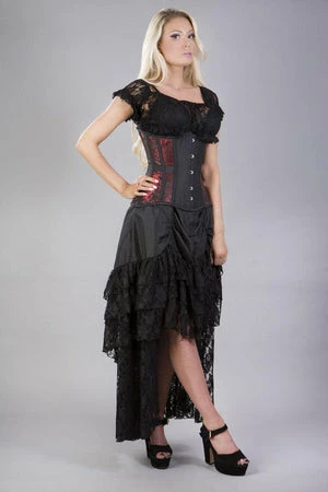 This Morgana underbust burlesque steel boned king brocade and black taffeta corset has clip fastening, laces and modesty panel at the back.