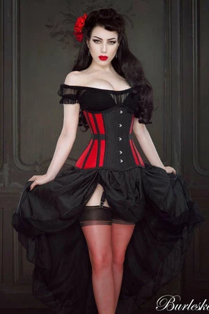 This Morgana underbust burlesque steel boned taffeta corset has clip fastening, laces and modesty panel at the back.