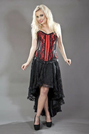 This Petra long line overbust burlesque satin corset has black lace overlay, zip fastening, laces and modesty panel at the back.