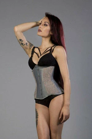 This Sylvie underbust burlesque steel boned corset in taffeta with lace has clip fastening and back lace fastening with modesty panel.