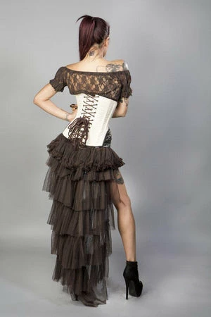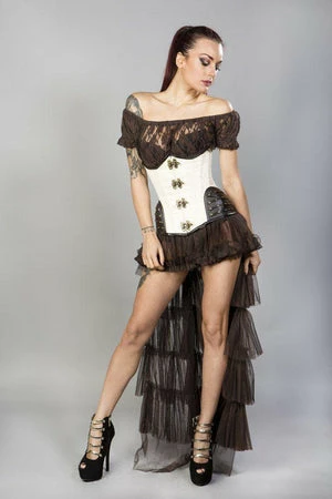 This Warrior underbust steel boned steampunk cream brocade corset has brown matte hip panel, c-lock fastening, laces and modesty panel at the back.