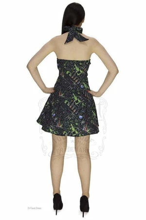 The sleeveless stretchy dress has an Alchemist print, halterneck, cross back, straps, and a figure accentuating shape.