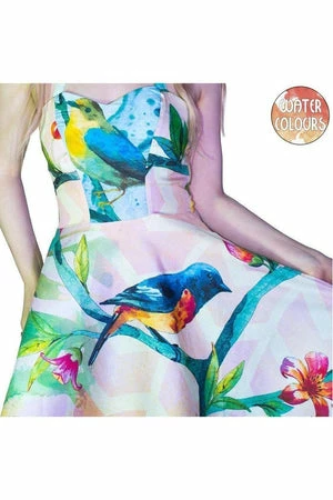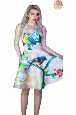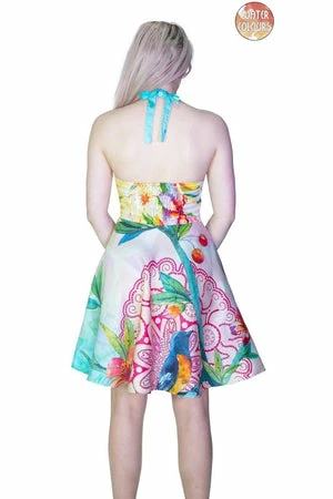 The sleeveless non-stretch mini dress has birds and flowers pastel print, halter neck, strap detail and a figure accentuating shape.