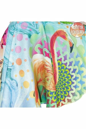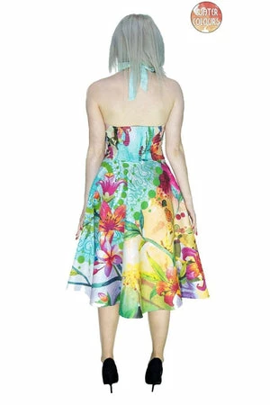 The sleeveless non-stretch dress has watercolour flowers and flamingo print, halterneck, full circle skirt and a figure accentuating shape.