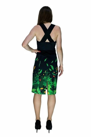 The sleeveless stretchy black midi dress has green leaves, dandelions and butterflies print, halterneck, black waist belt, front faux buttons and a figure accentuating shape.