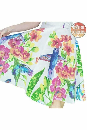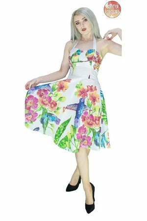 The sleeveless non-stretch dress has hummingbirds, parrots and flowers print, a halterneck, a full circle skirt and a figure accentuating shape.