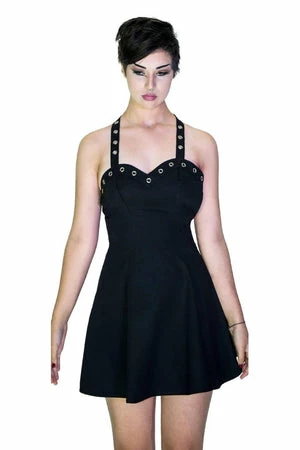 The sleeveless stretchy black mini dress has metallic silver eyelets detailing, halterneck tie, a sweetheart neckline and a figure accentuating shape.