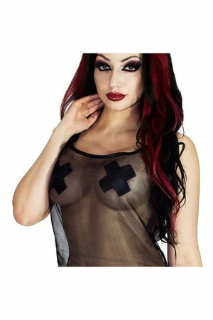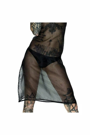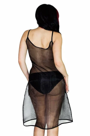 The sleeveless non-stretch, sheer black mini dress has a scoop neckline and a figure accentuating shape.