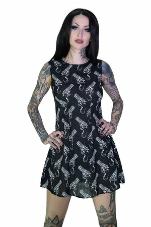 The sleeveless non-stretch, mini sheer dress has white guns print, a chequered pattern, a round/jewel neckline, a figure accentuating shape and it fastens with a hidden zipper.