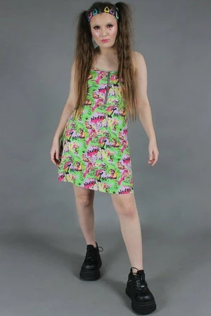 The sleeveless shift style mini dress has fuzzy animals print, V-neckline, back cross detailing, a figure accentuating shape and it fastens with an O-ring zipper at the front.