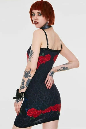 This stretchable, fitted slip dress style has black lace details around the neck and is also decorated at the back with a roses and gothic pattern print.