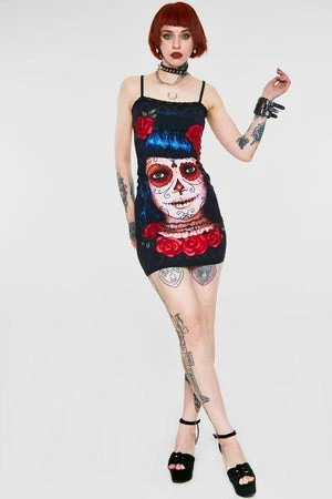 Break some hearts in this eye-popping number from Jawbreaker, this day of the dead black dress has a colourful print of a deadly Mexican dame with blue black hair, painted face and surrounded with red roses.