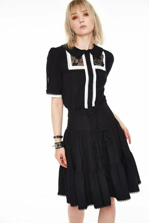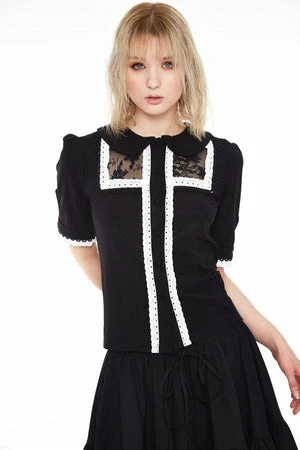 This dark top has a round neckline, short sleeves, peter pan collar, white trim edging and lace panels detailing.