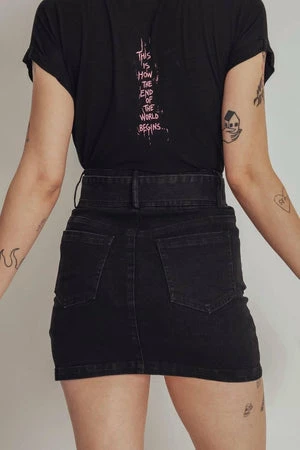 This A-line mini skirt has heart buckle detailing, front and back pockets and a flattering fit.