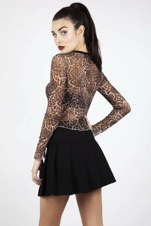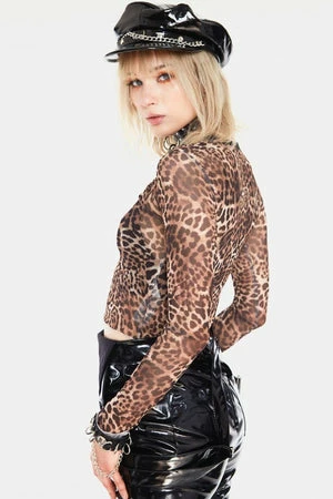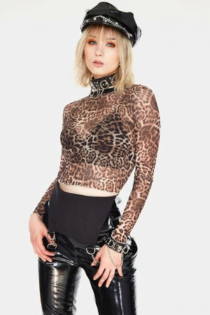 This mesh top has a leopard print, a crew neckline, long sleeves and a figure accentuating shape.