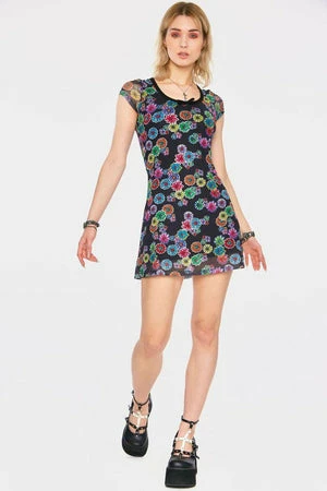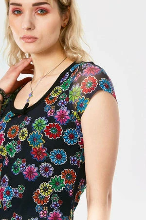 The t-shirt style mesh dress has all over floral print, a round neckline, short sleeves and a flattering fit.