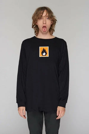 Cause hell burnin’ fire in this unisex long sleeve t-shirt by Long Clothing, available in white and black and featurnig a front blazing flammable print and back “HIGHLY FLAMMABLE” caption.