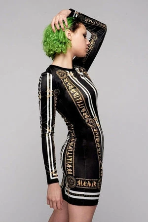 This is a wicked, black, white and gold bodycon dress from Long Clothing called “Stay Gold”, which is embellished with fearsome tribal style details and runic writing.