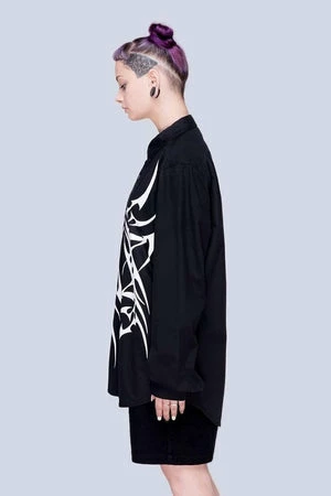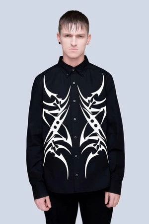 This is an awesome 100% cotton black, unisex, buttoned shirt from Long Clothing which has a formidable tribal design on the front.
