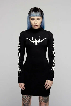 For the ultimate dark dresser this is an epic black, long sleeved bodycon dress from Long Clothing with a formidable white tribal print on the chest and arms.
